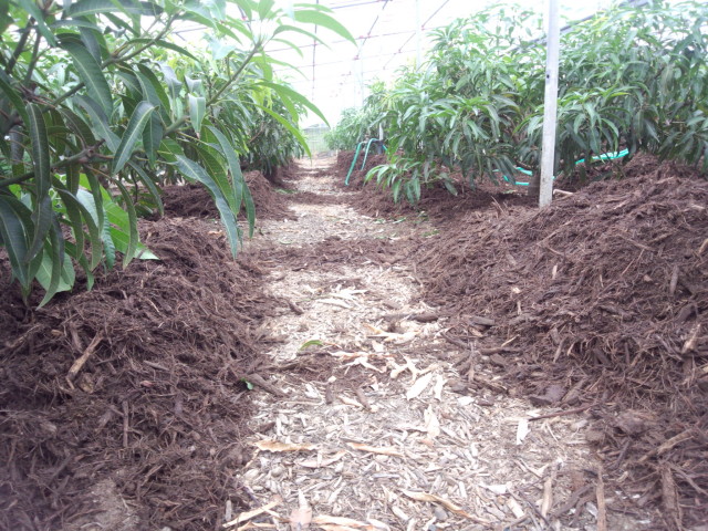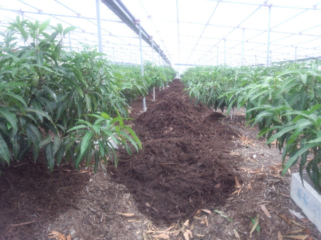 マンゴーを植え付けしてからの枯葉や草の投入は、ハウス内への害虫の侵入の恐れがあるので、植え付け後は木のチップ材を大量に購入し毎年ハウス内へ敷き詰めます!
